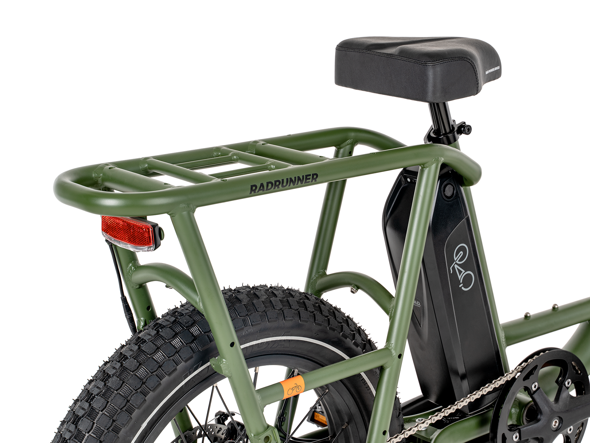 Custom Rad Power Bikes moped-style saddle with extra padding, fixed angle, and integrated steel seat post